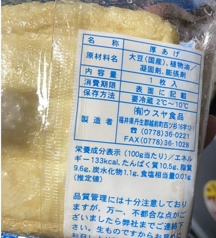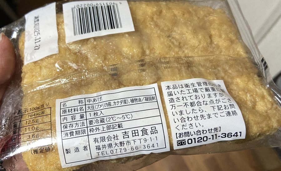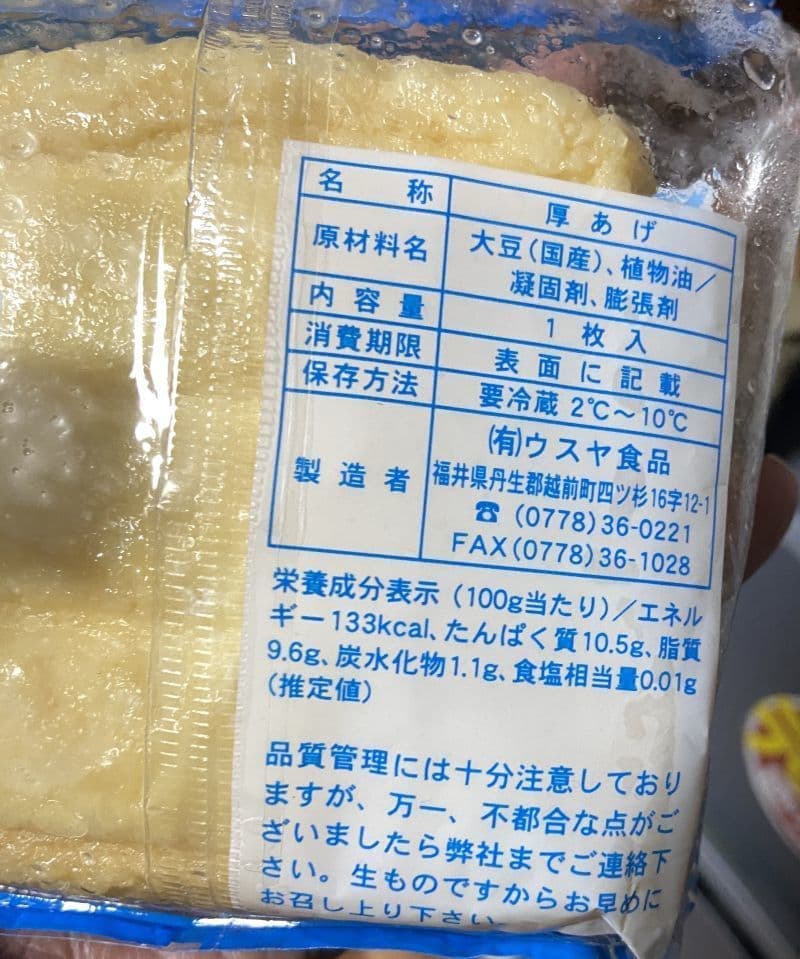 そんな中、一方でその豆腐感を残した分厚い厚揚げが、江戸時代末期に織田町大王丸(旧福井県丹生郡織田町、現在の越前町、名前の通り織田町は織田信長一族発祥の地ともいわれます)で創業のウスヤ食品さんの厚揚げです。